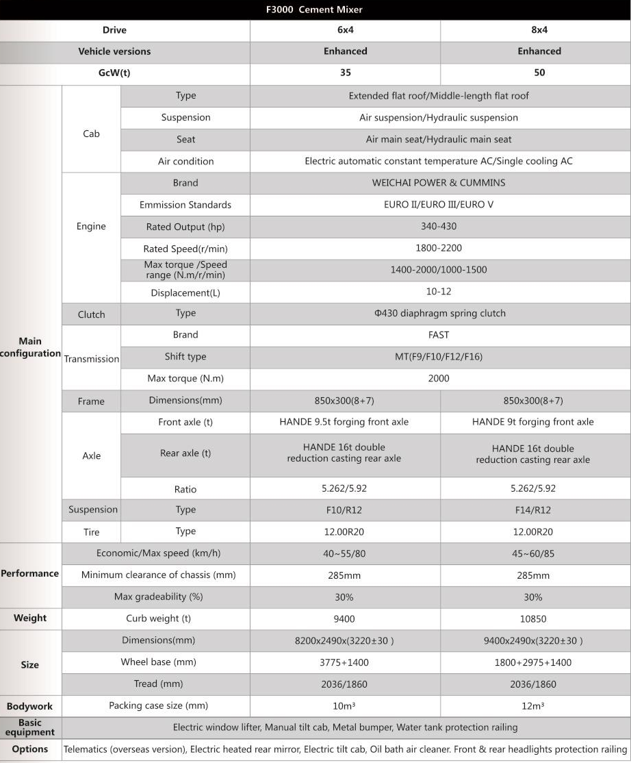 चेसिस र शक्ति प्रणाली: शा Canjan F3000 XX4 र 8X4 सिमेन्ट मिक्सर ट्रक, जसमा प्रशस्त शक्ति, उच्च टूर्विट र राम्रो यात्राको प्रदर्शन छ। प्रोफेस साइटमा जटिल सडक सर्तहरू अन्तर्गत ट्रकको उत्कटता र स्थिरता सुनिश्चित गर्न फास्ट प्रसारण र मानव अक्षसँग मिल्दोजुल्दो छ।